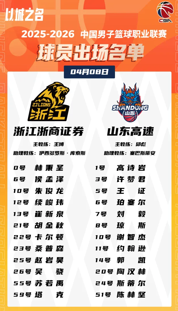 虎扑04月08日讯 今日CBA常规赛,广厦对阵山东的大名单已经公布。